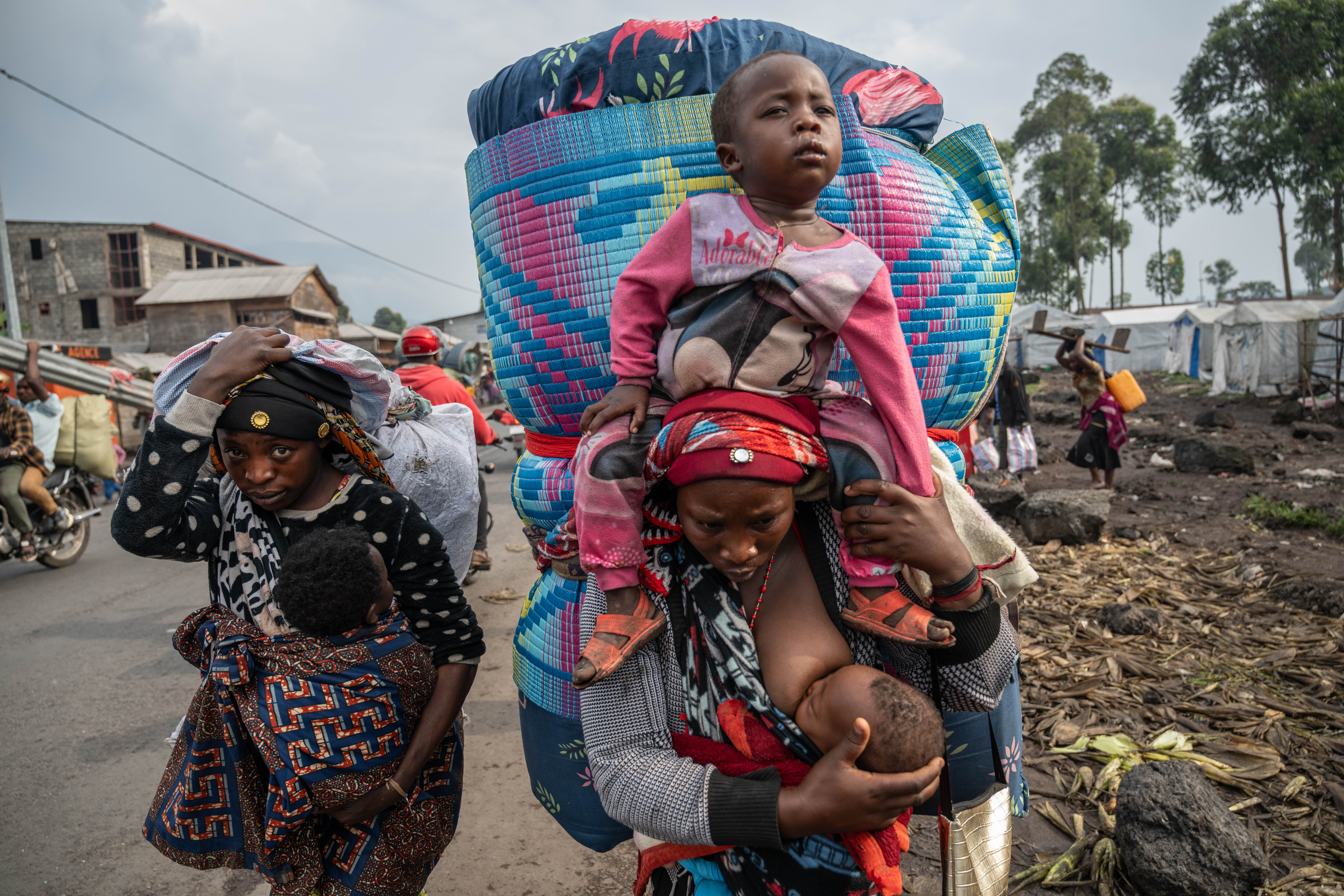 3. Residents flee fighting between M23 rebels and Congolese forces near Kibumba, some 20 kms (12 miles) North of Goma, Democratic Republic of Congo, Saturday Oct. 29, 2022. A little girl fleeing the war with her braid on her head.