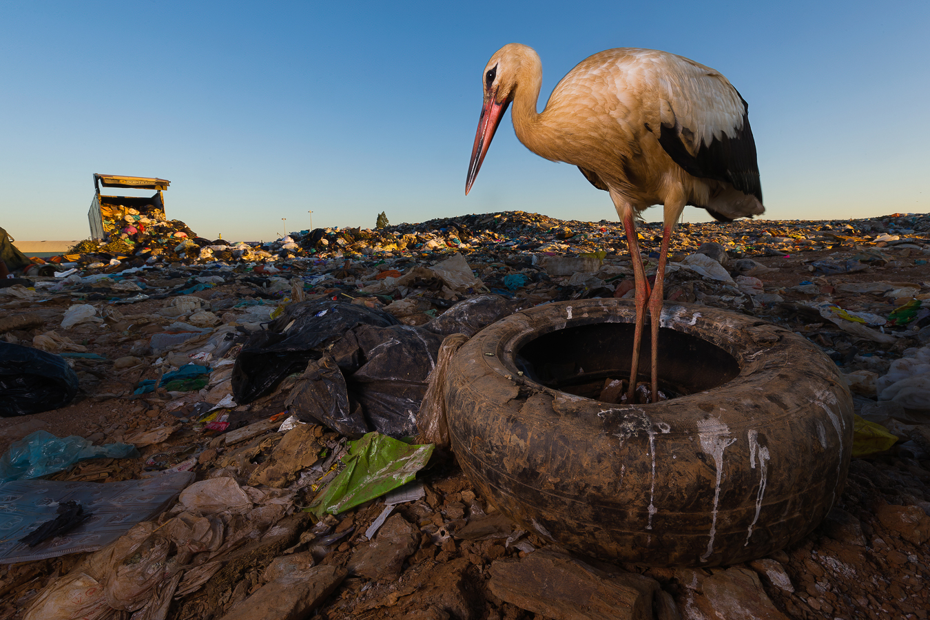 A white stork stands on a landfill in southern Spain, where year-round waste has created new feeding grounds. Once a symbol of new life, the stork now survives on human discard—its migration patterns reshaped by our appetite for convenience.