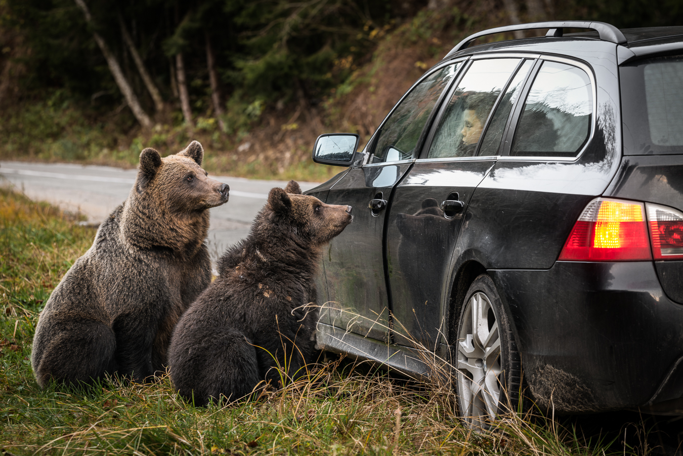 A boy watches from a car as a mother bear and her cub approach, hoping for food. Repeated feeding has reshaped their instincts—blurring the line between wild and tame, and complicating how future generations will relate to wilderness itself.