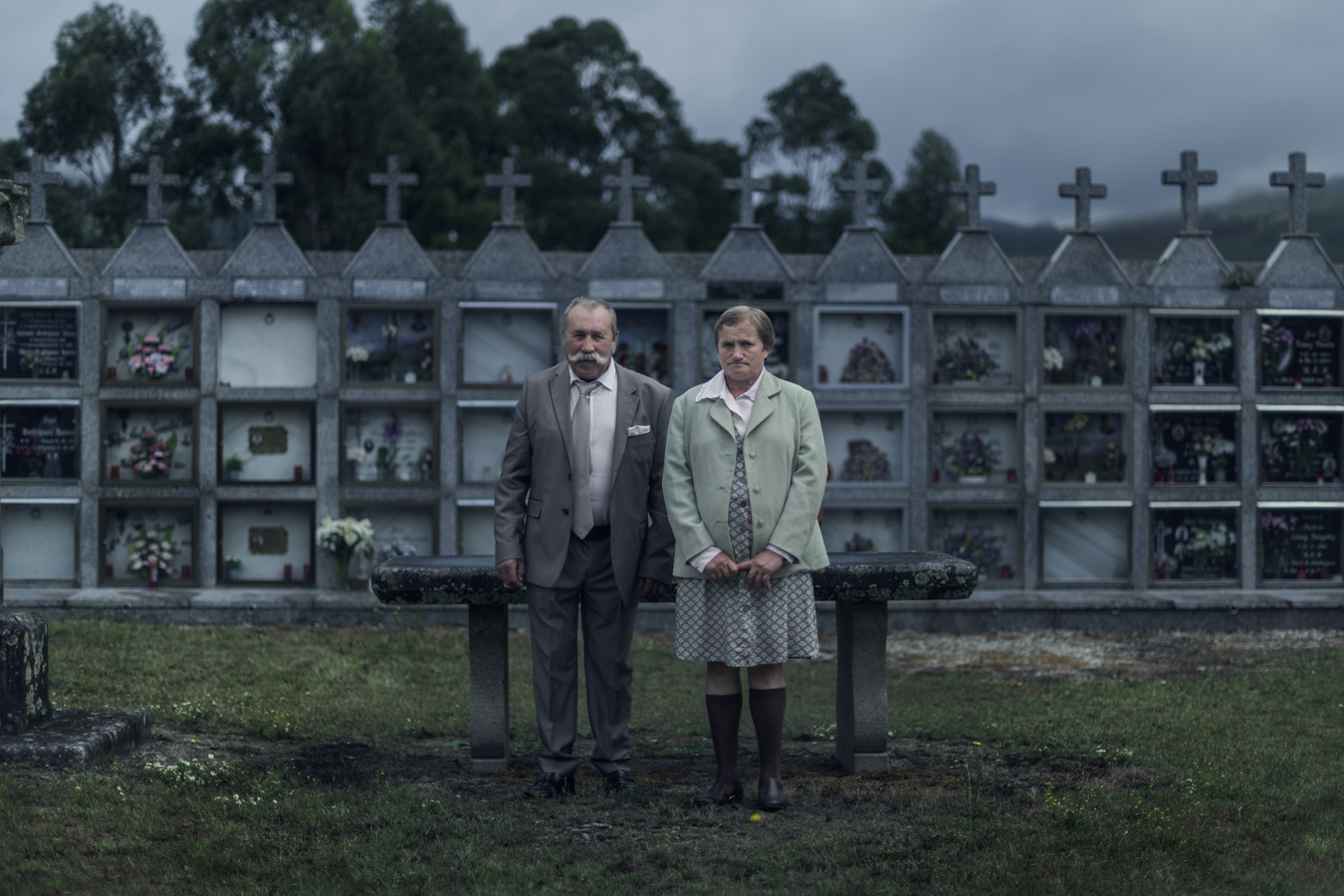 José Gonzalo, 67, and Inés Grova, 57, pose for a photograph in the cemetery of Santa Marta de Ribarteme, in As Neves (Pontevedra).