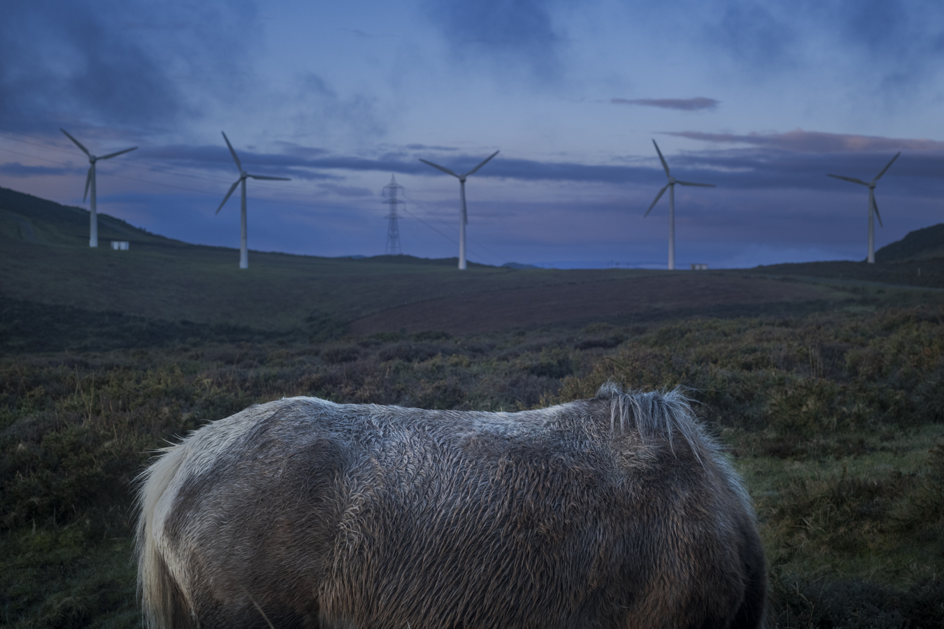 A wild horse in front of the wind turbines at a wind farm in Muras (Lugo). The municipality of Muras in Lugo, with a population of 600, has the most wind turbines in Galicia. It has a total of 20 wind farms and 381 wind turbines spread across its entire area.