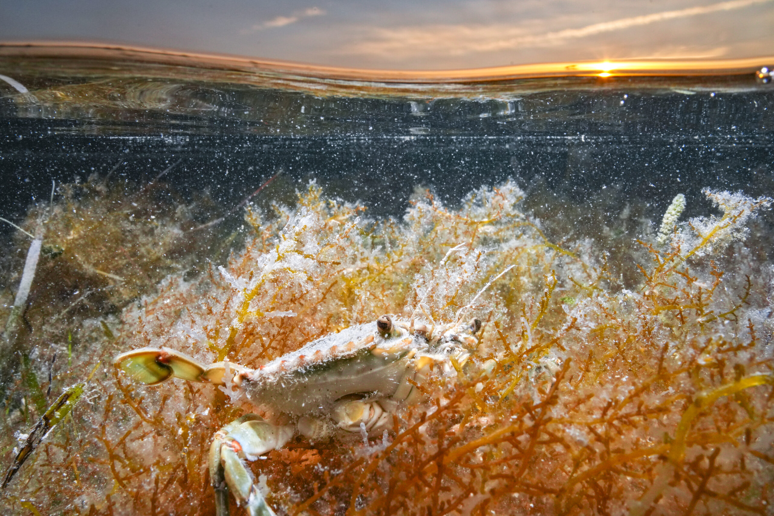 A blue crab sits in a bed of seaweed as the sun sets along the Florida Bay. Its front pinchers are missing, likely lost in a recent battle or in the molting process.