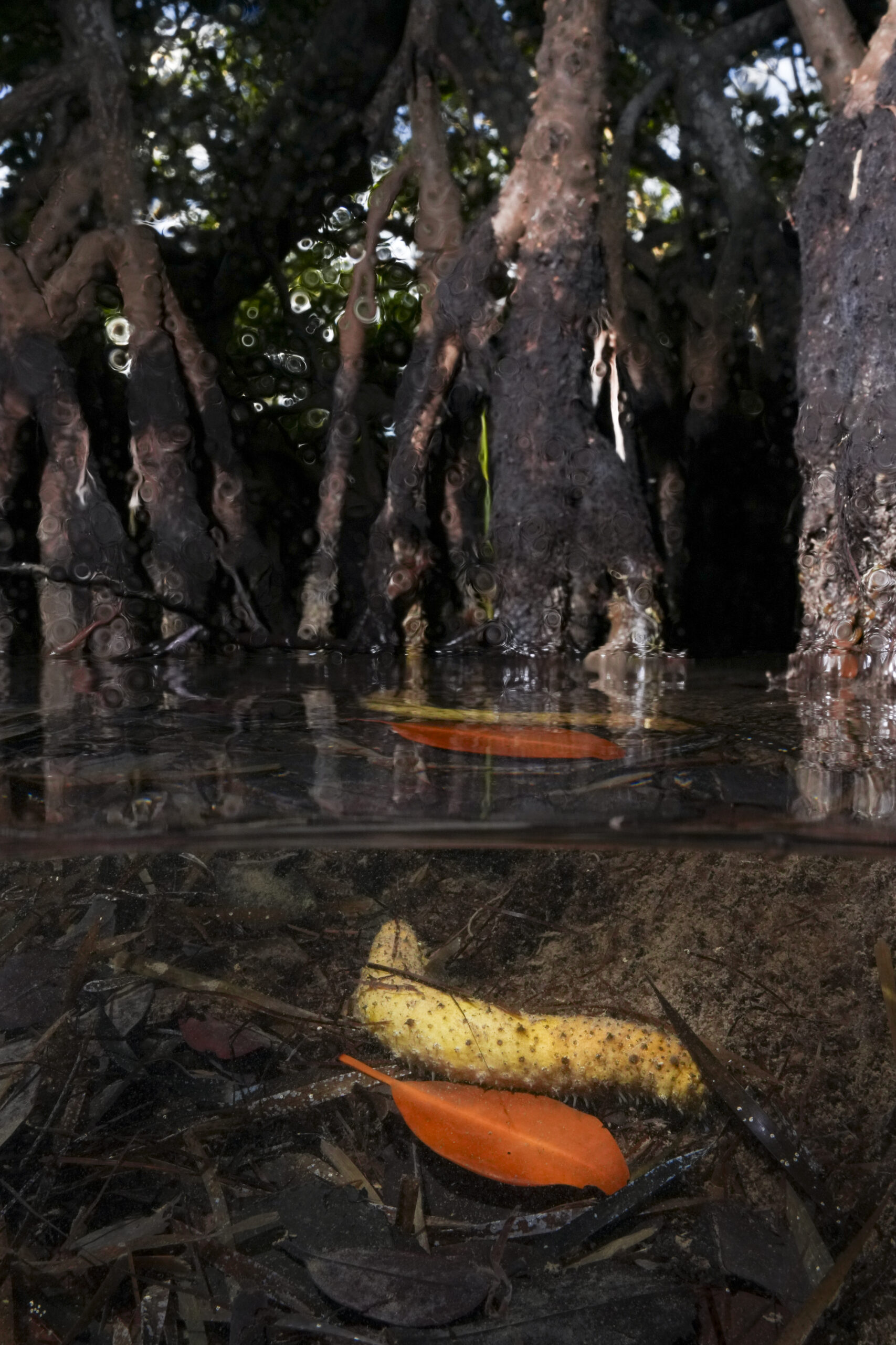 A yellow Florida sea cucumber (Holothuria floridana) feeds on ditritus in the shallows of the mangrove forest, beside a fallen red mangrove (Rhizophora mangle) leaf.