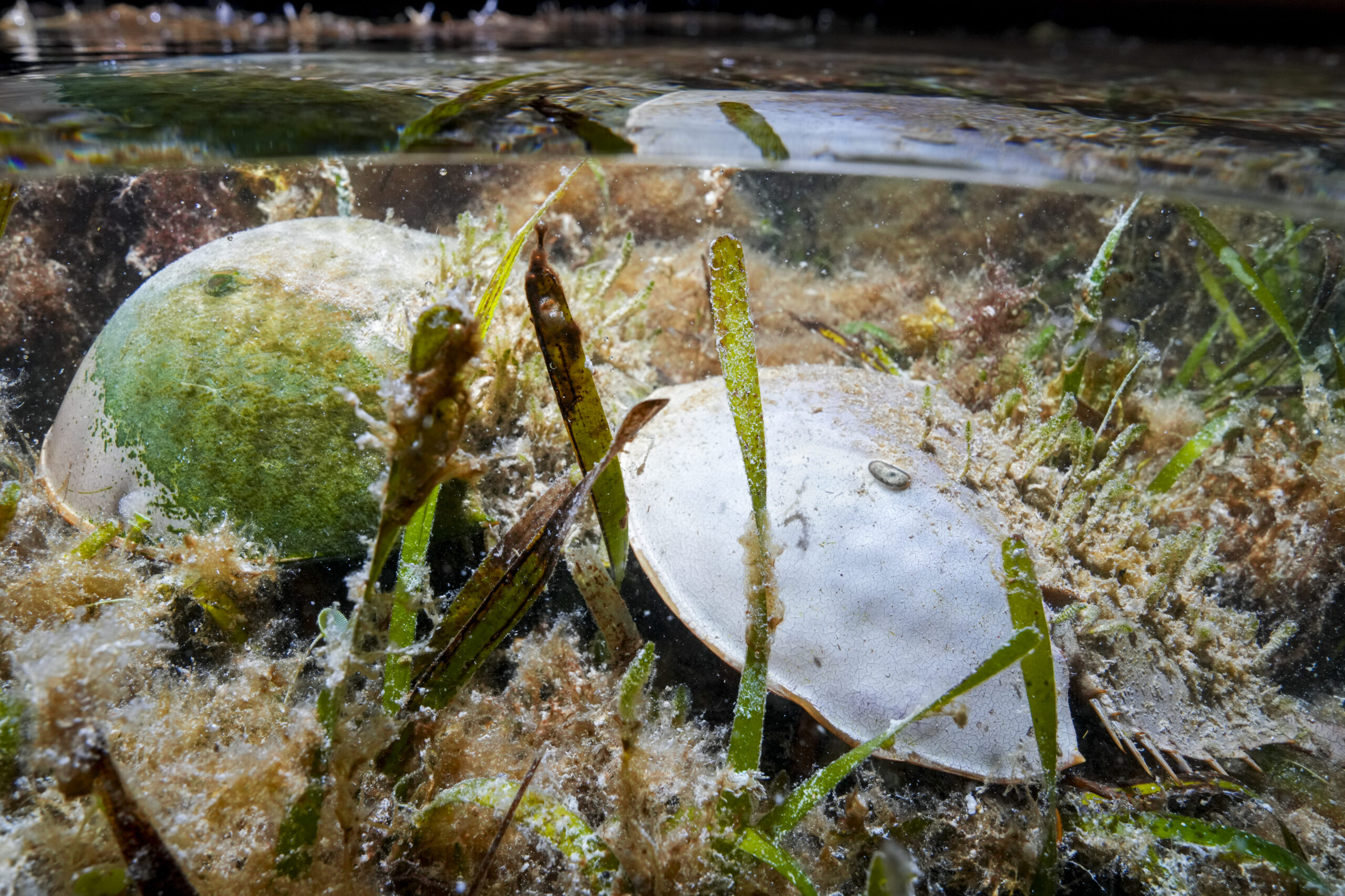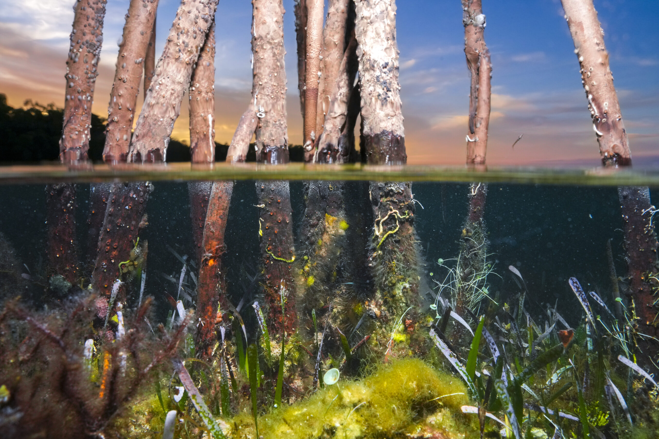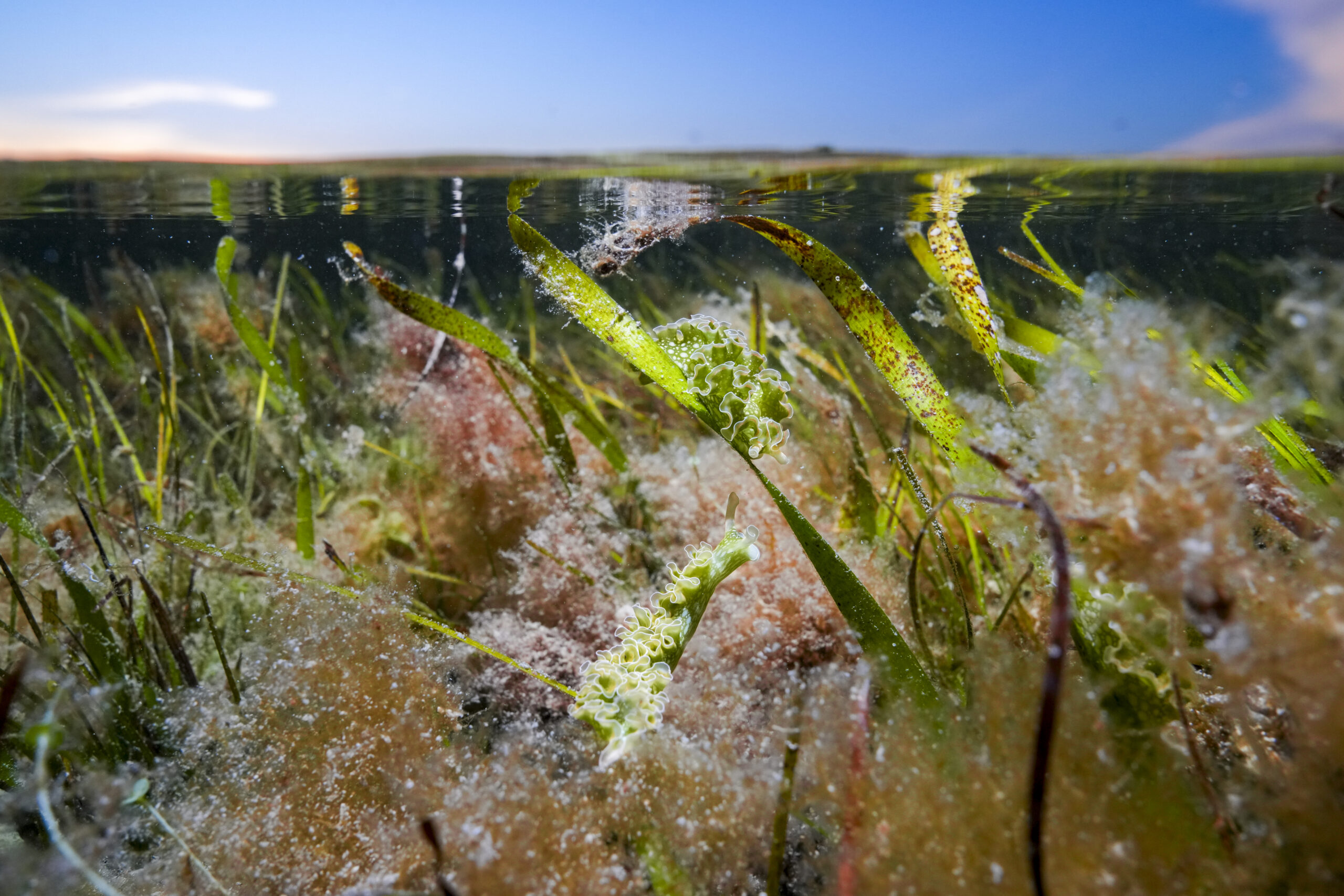 Turtle grass (Thalassia testudinum), calcareous tube worms, marine snails, and various kinds of macro algae create a mosaic of life just below the water’s surface at sunset.