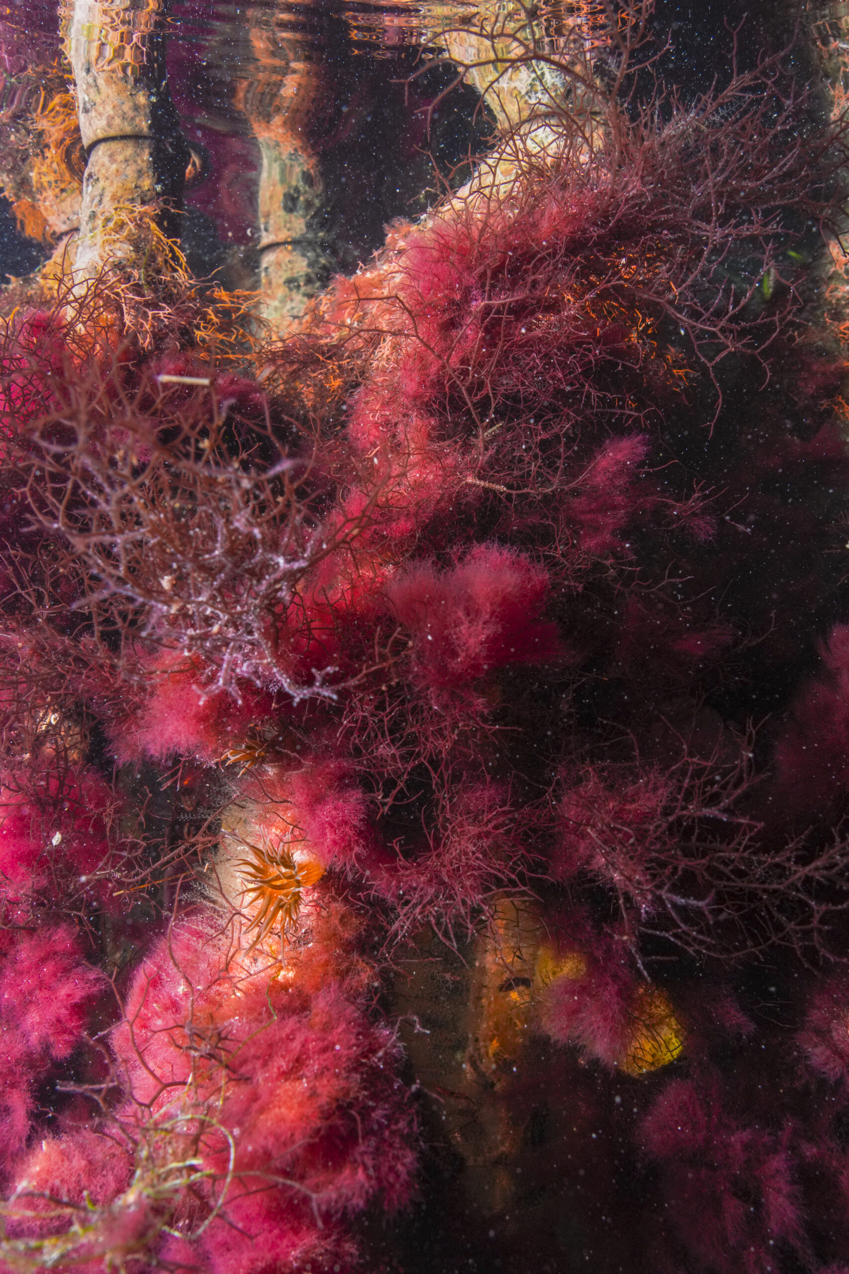 Cooler winter weather brings vibrant colors to the underwater world of mangroves. A glass anemone (aiptasia pallida) takes the spotlight amidst fuzzy pink Cotton Candy algae (Callithamnion).