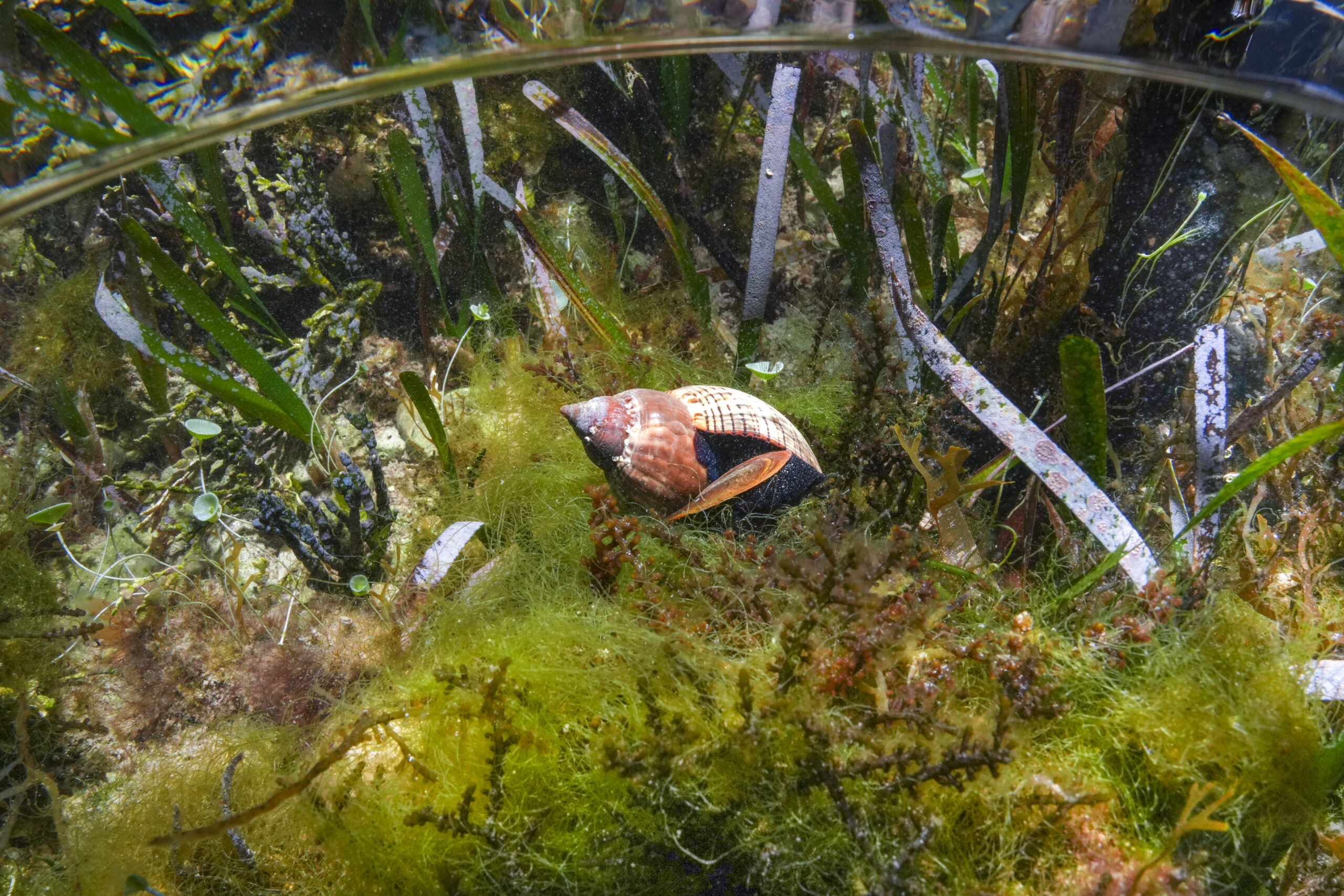 A True Tulip snail (Fasciolaria tulipa) rests on a bed of green chaetomorpha algae; its purple galaxy patterned flesh peaks out behind its lid-like operculum.
