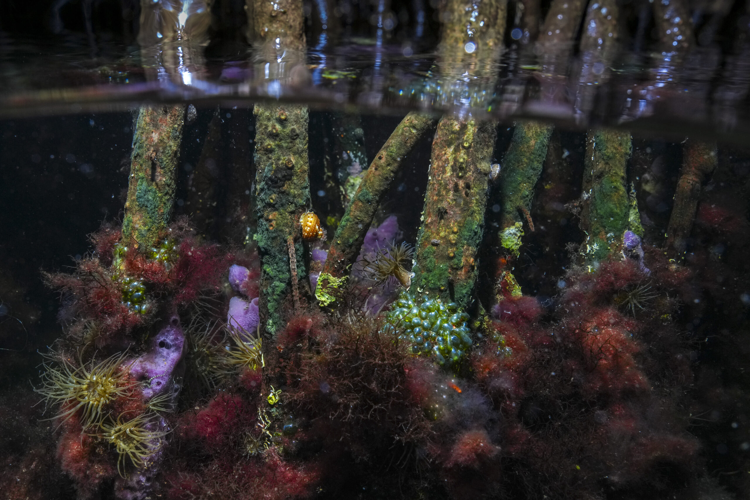 When the sun sets, life below the surface wakes. A closer look reveals turbo snails, isopods and anemones feasting amongst red seaweed, while a brittle star’s (class Ophiuroidea) legs peak out from inside a purple tunicate. Commonly known as bubble algae or sailor’s eyeball, the curious pearl-like algae (Valonia ventricosa) clustered on the mangrove roots is one of the largest single-celled organisms on Earth.